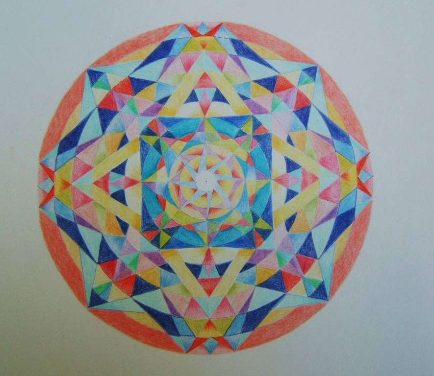The word Mandala means "circle" in Sanskrit. I have been creating manadalas for many years as a form of active meditation. The shape of a circle represents wholeness, a model for the orgaizational structure of life itself, similar to fractals -- a cosmic and mathematical diagram modeling the organizational structure of the world extending both beyond and within our bodies and our relation to the infinite.